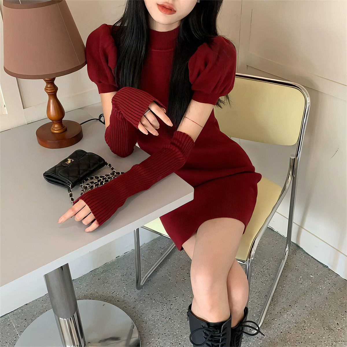 女泡泡袖打底内搭包臀裙